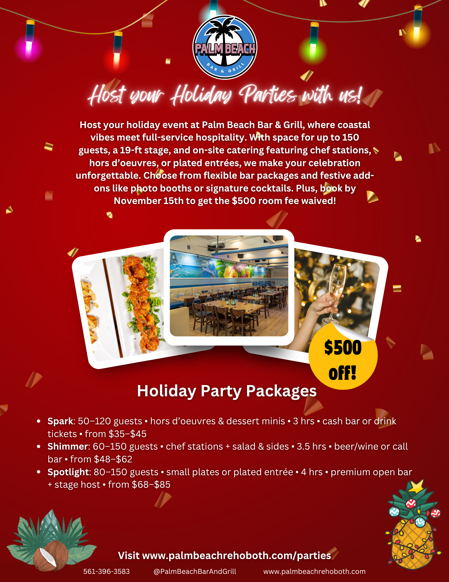 Host your holiday event at Palm Beach Bar & Grill, where coastal vibes meet full-service hospitality. With space for up to 150 guests, a 19-ft stage, and on-site catering featuring chef stations, hors d’oeuvres, or plated entrées, we make your celebration unforgettable. Choose from flexible bar packages and festive add-ons like photo booths or signature cocktails.